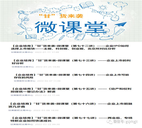 為保證培育任務(wù)不停擺、不斷檔,甘肅股權(quán)交易中心持續(xù)推進(jìn)培訓(xùn)工作,開辟線上培訓(xùn)、講座新路徑。第一季度已累計舉辦線上培訓(xùn)講座18場,培育667人次。一方面通過“甘”貨來襲·微課堂開展上市融資、專精特新政策導(dǎo)向等方面解讀,精準(zhǔn)解答中小企業(yè)發(fā)展中遇到的困惑;另一方面利用科融通云講堂系列培訓(xùn)課程及心流慧估“專精特新”企業(yè)服務(wù)系列培訓(xùn)課程,深入剖析新階段行業(yè)趨勢和機(jī)遇,助力企業(yè)長期高速發(fā)展。